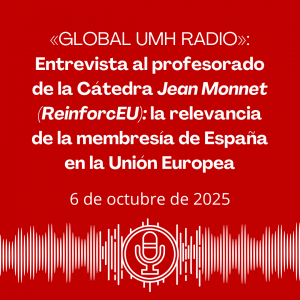 Las Profesoras de la UMH Elena Crespo Navarro y Rocío M. Pozo Tomás, miembros del equipo de la Cátedra Jean Monnet ReinforcEU, participaron el día 6 de octubre de 2025 en el programa Global UMH Radio, presentado y codirigido por Pablo Aliaga y Pedro Sáez (control técnico).